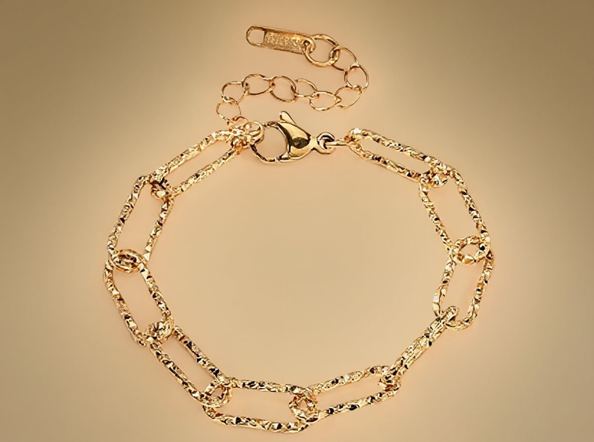Un bracelet d'une rare beauté grâce à ses larges anneaux texturés, acier inoxydable doré ou argenté (qualité chirurgicale).