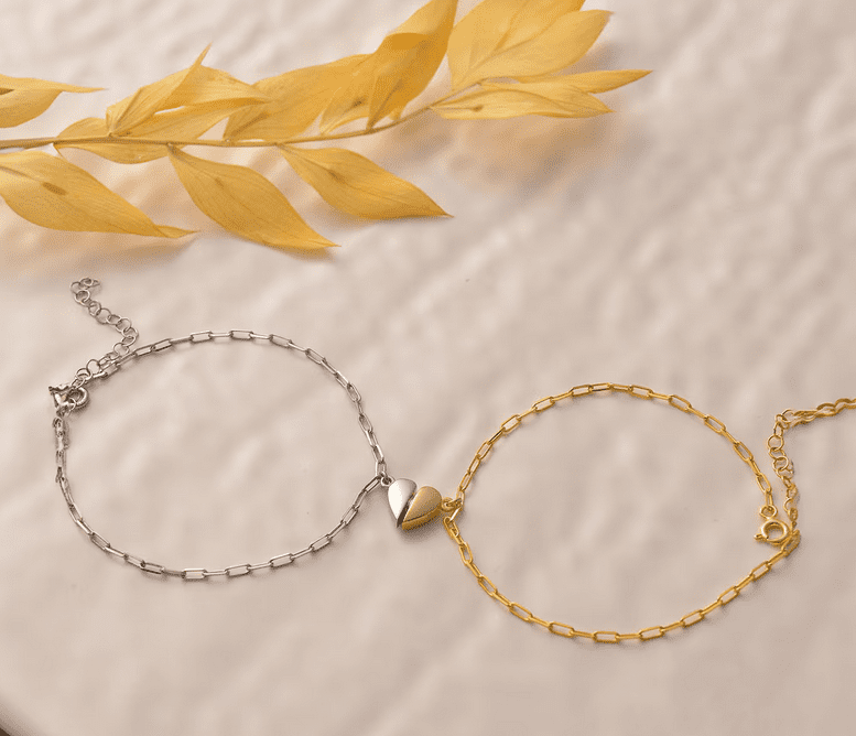 2 Bracelets doré/argenté avec coeur magnétique (acier inoxydable, qualité chirurgicale).
