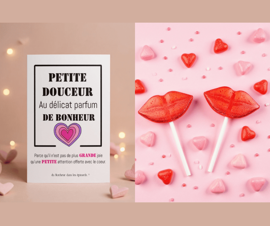 A la fois symbolique & gourmande, optez pour cette Carte + 2 Sucettes BISOUS (parfum fraise) qui associent à la fois mots de TENDRESSE + une petite gourmandise !