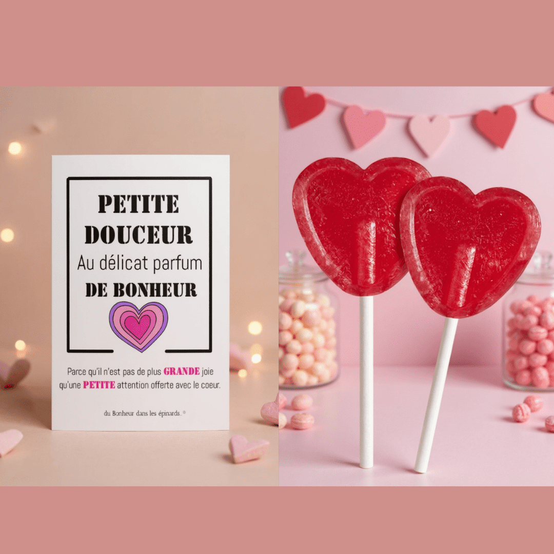 A la fois symbolique & gourmande, optez pour cette Carte + 2 Sucettes COEURS (parfum fraise) qui associe à la fois mots de TENDRESSE + une petite gourmandise !